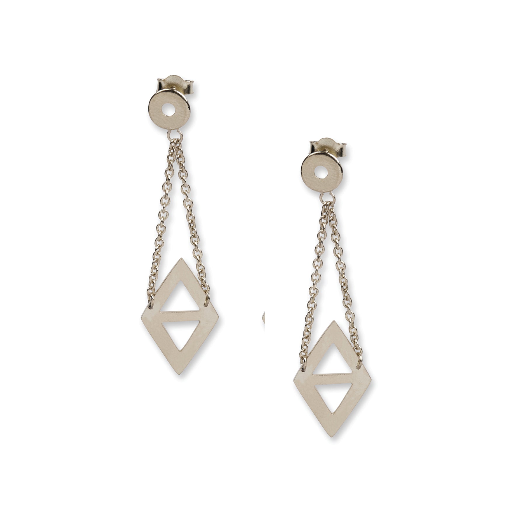 Sterling Silver post earrings, 1.3" featuring a divided diamond suspended from two silver rope chains. Designed by Paromita. The diamond is an iconic symbol of abundance in almost every culture. In Indian art, the shape is incredibly significant - it represents strength, power, courage, fortitude, creativity, imagination, purity, harmony, faithfulness, and innocence. In fact, diamonds are believed to fill negative spaces in oneself with the purity of love!