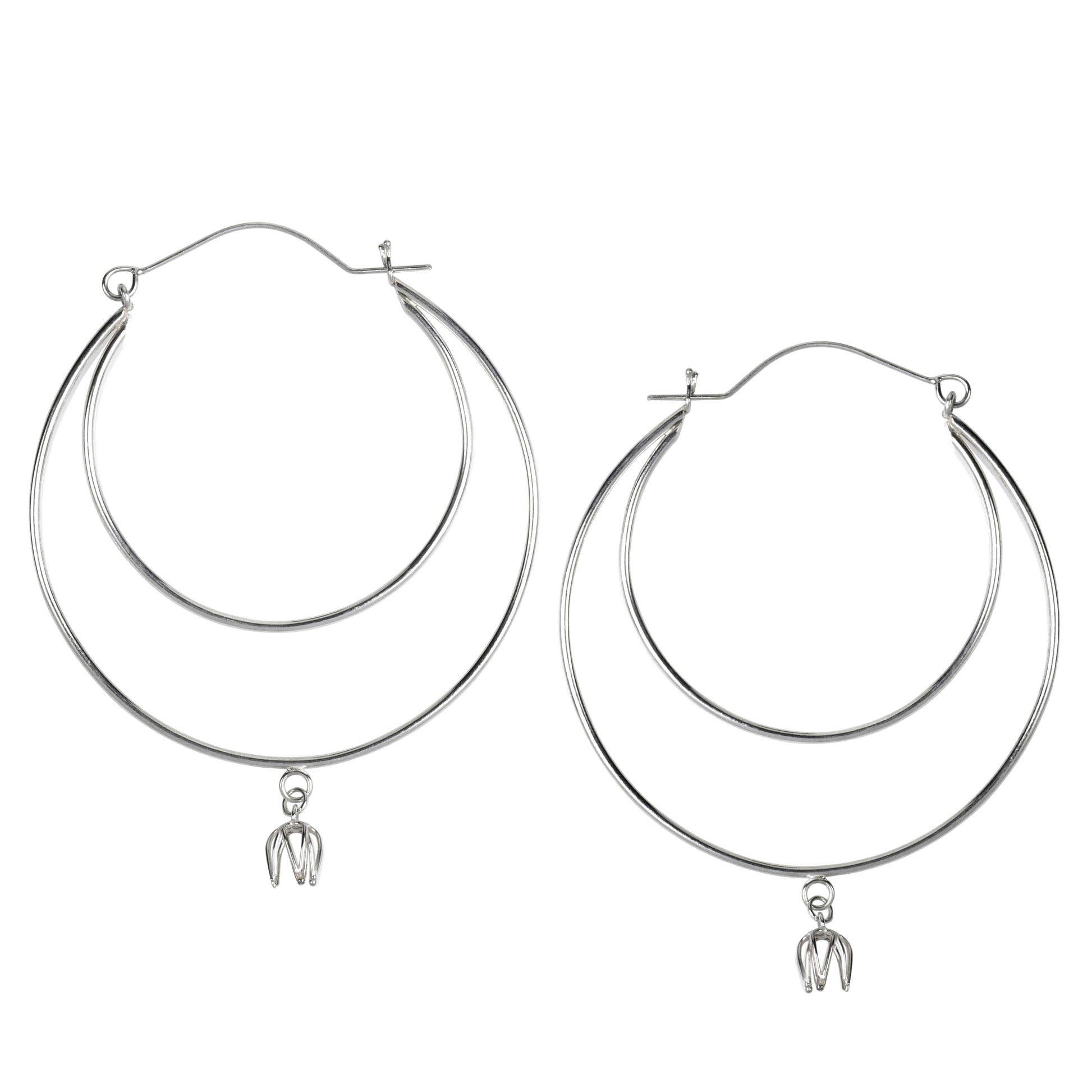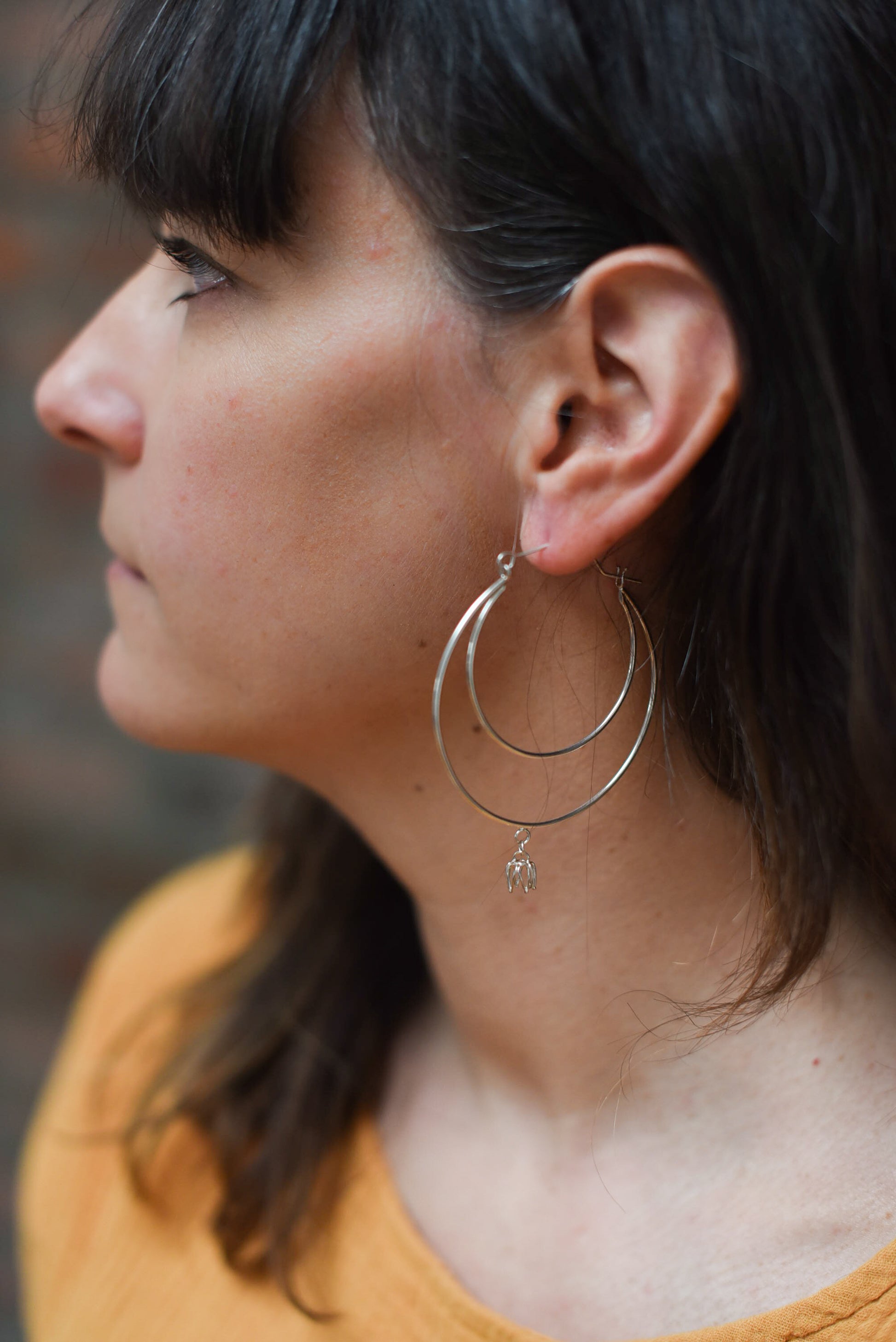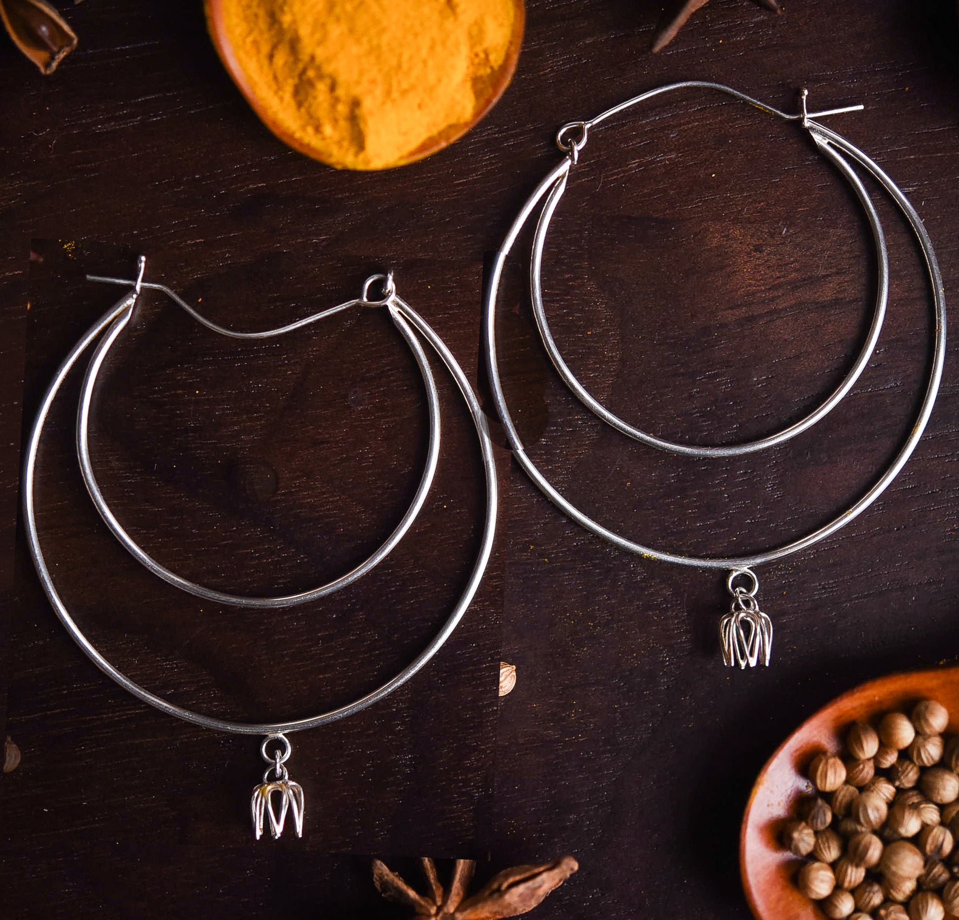 Handmade, Sterling Silver, modern hoop earrings with plenty of spice. Inspired by ancient tribal jewelry, tiny bell pods are suspended under the hoops, referencing a classic design found in India. Every aspect of this earring is handmade.