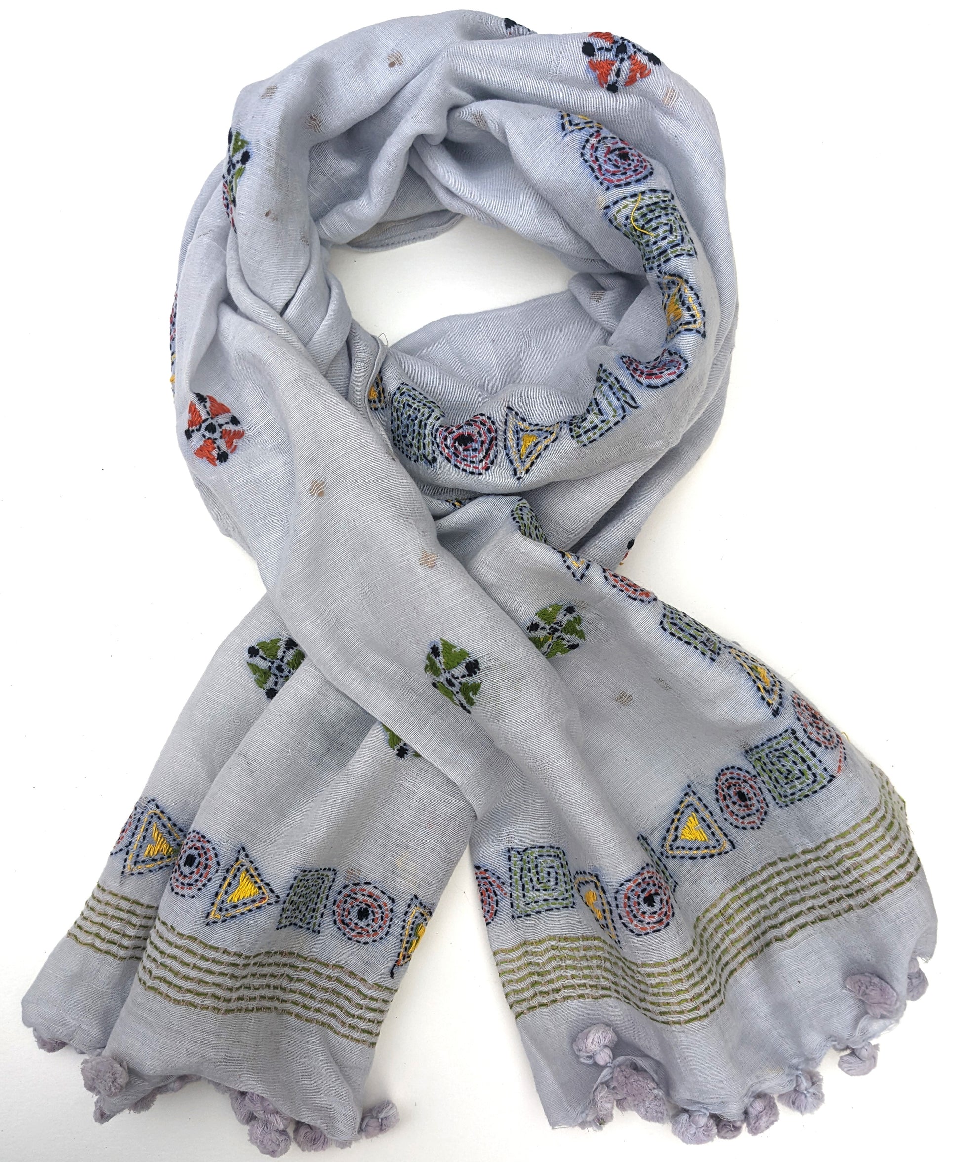 Cotton muslin, hand embroidered scarf with pom-pom fringe - 20" x 75". Earning their own income enables women to support their children and to rise up out of poverty and exploitation, Each scarf is as unique as the woman who made it. Embroidery designs vary.