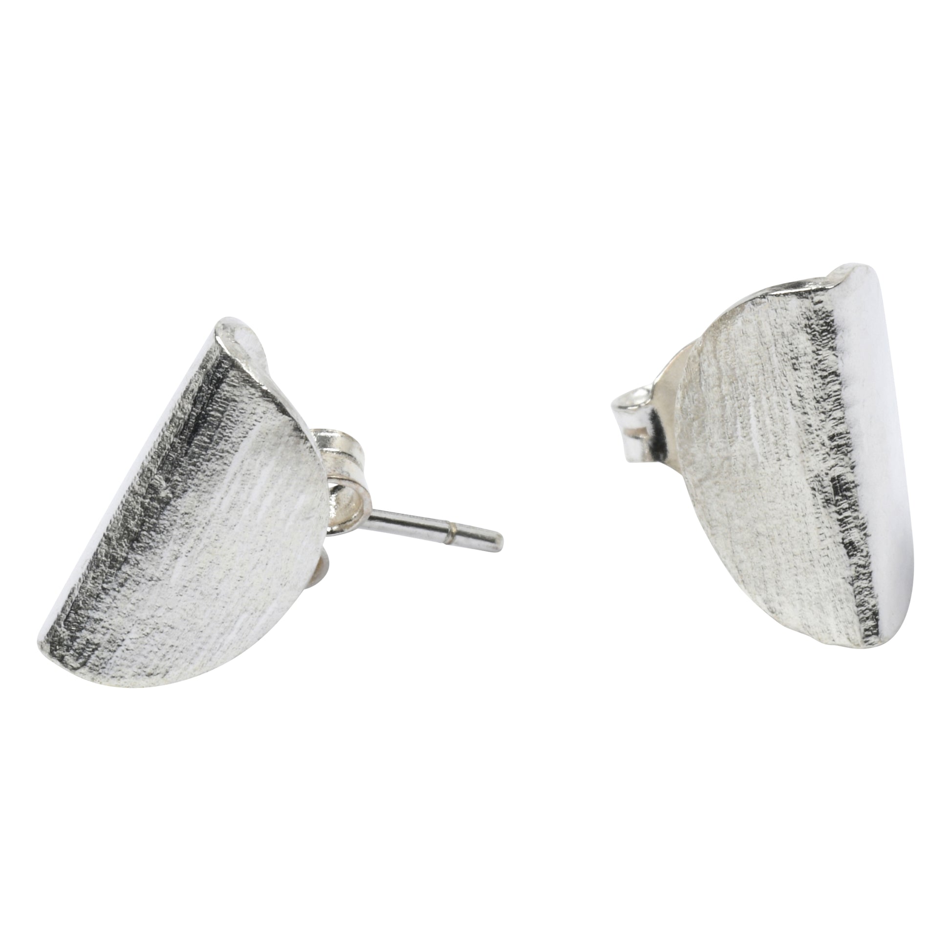 The Fatima Stud Earrings are a unique and elegant addition to any jewelry collection. These . 5" stud earrings are lightly hammered to create a subtle texture that adds depth and character. A circle bent to look like a half moon, each earring curves gracefully, offering a distinctive and contemporary look. The shine of the silver combined with the artisanal hammering technique makes these studs a perfect blend of simplicity and sophistication.