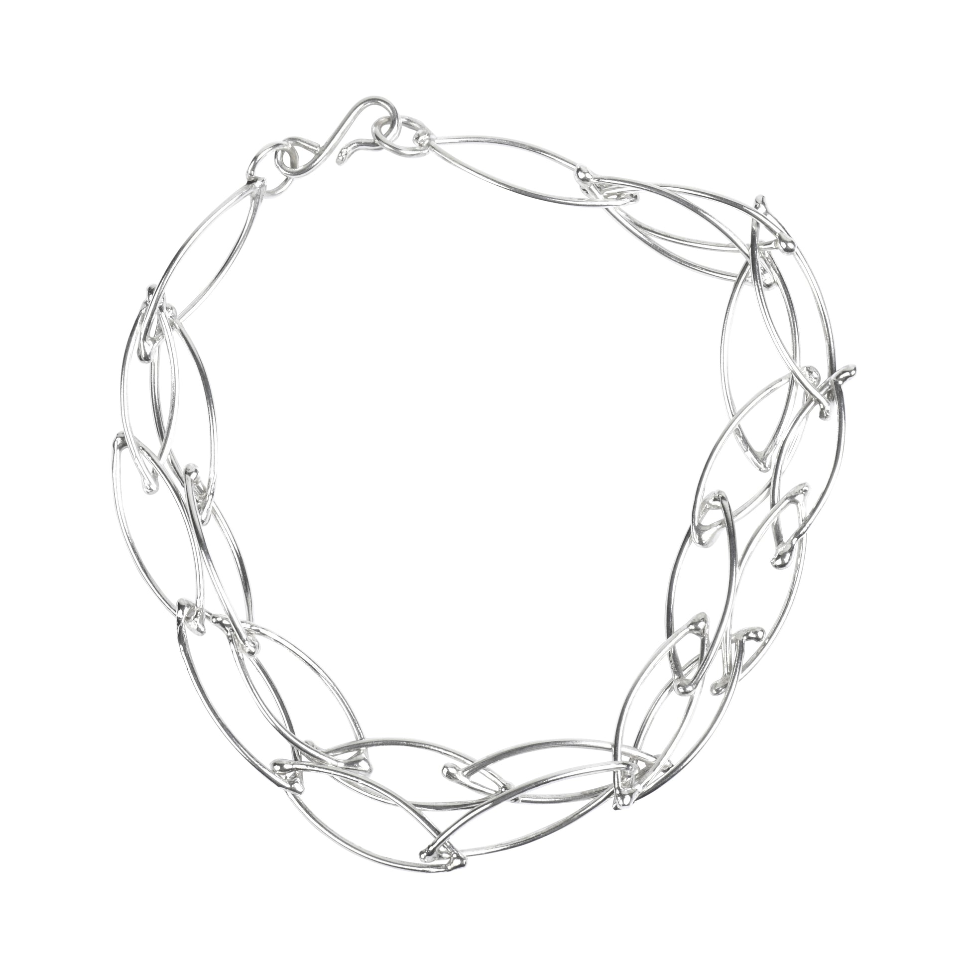 The Kajal Bracelet is comprised of two strands of handmade, sterling silver links, each in the shape of a seed. Kajal is a Hindi name that translates to "eyeliner" and is associated with talent and beauty. Inspired by the women we work with, combined with the fact that the seed shape of the link is also eye-shaped, we thought this a fitting name for this unique and completely handmade bracelet.