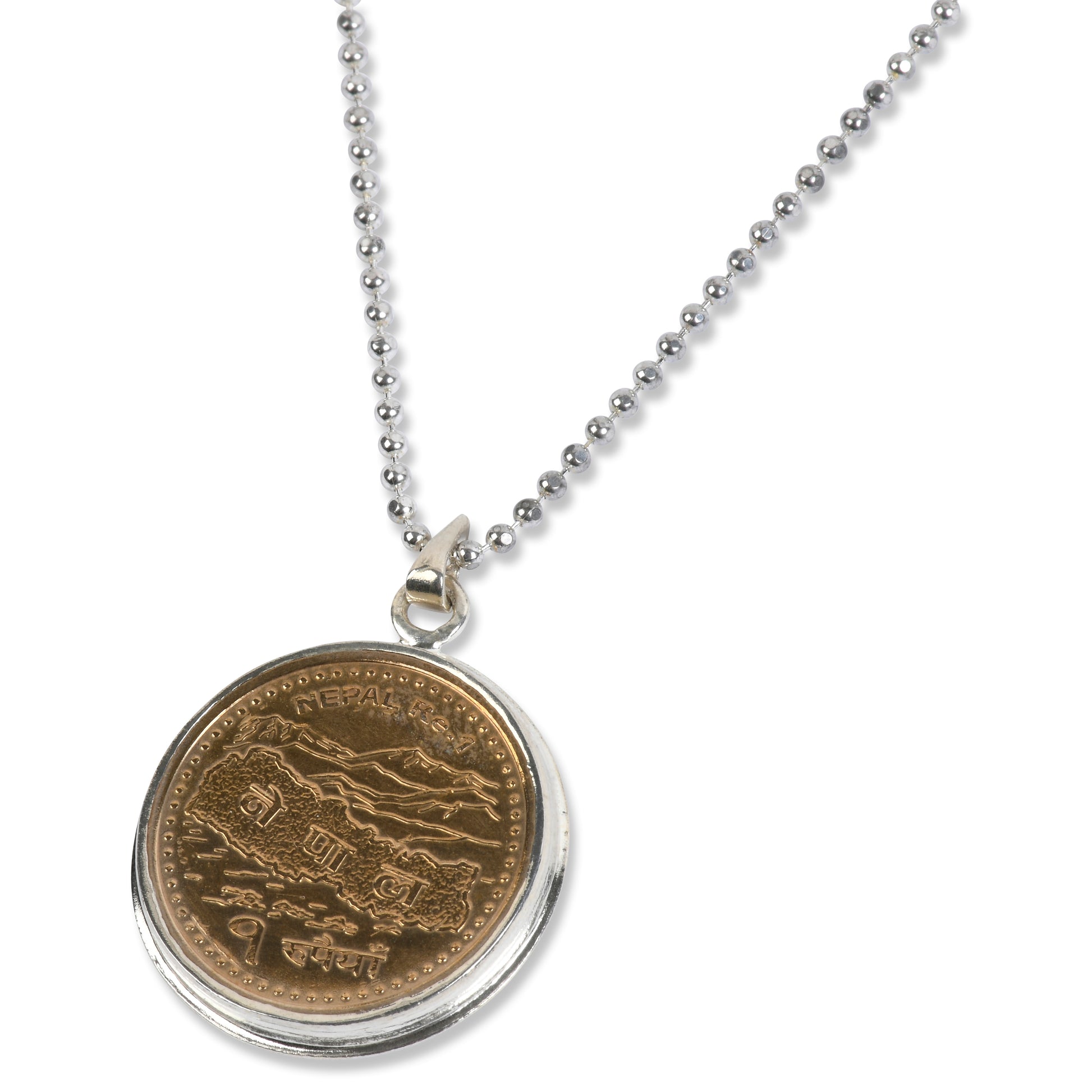 An actual rupee coin from Nepal, set in Sterling Silver. 1" pendant on 18" Sterling Silver ball chain. Made by the talented artisans of Lily's Leaves, Kathmandu, Nepal. Representing our wish for abundance for all who wear it, and those who make it!