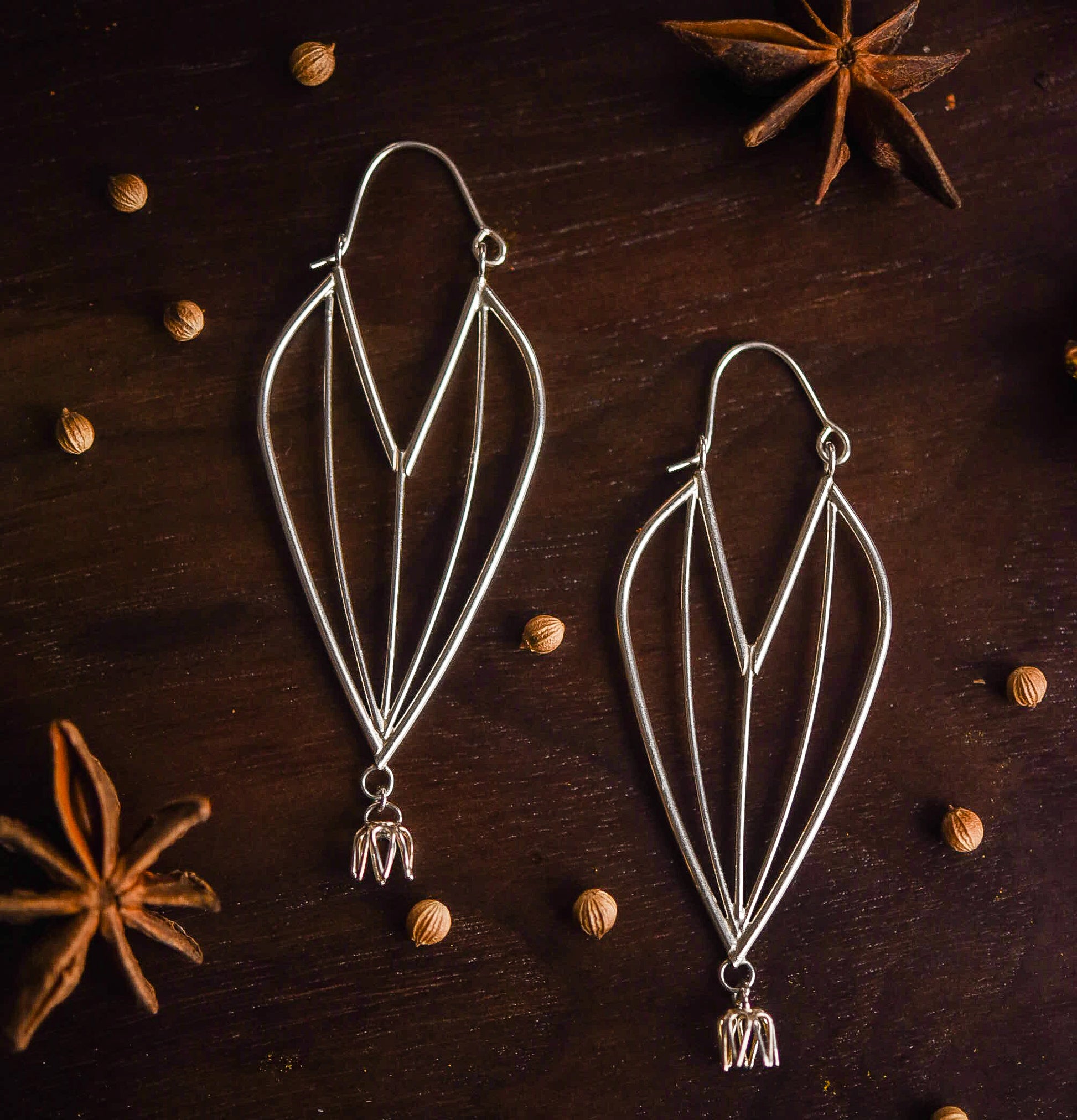 Inspired by a motif found in ancient Indian tribal jewelry, these dramatic spear-shaped earrings are accented with a tiny, handmade bell pod. The spear has design details reminiscent of a cardamom pod and its ribbed texture. Spices continue to inspire this collection yet the result is modern, sleek and fun. An empowering design that radiates feminine strength resonated deeply and we dubbed these earrings "Rani", which means "Queen" in Hindi and Bangla.