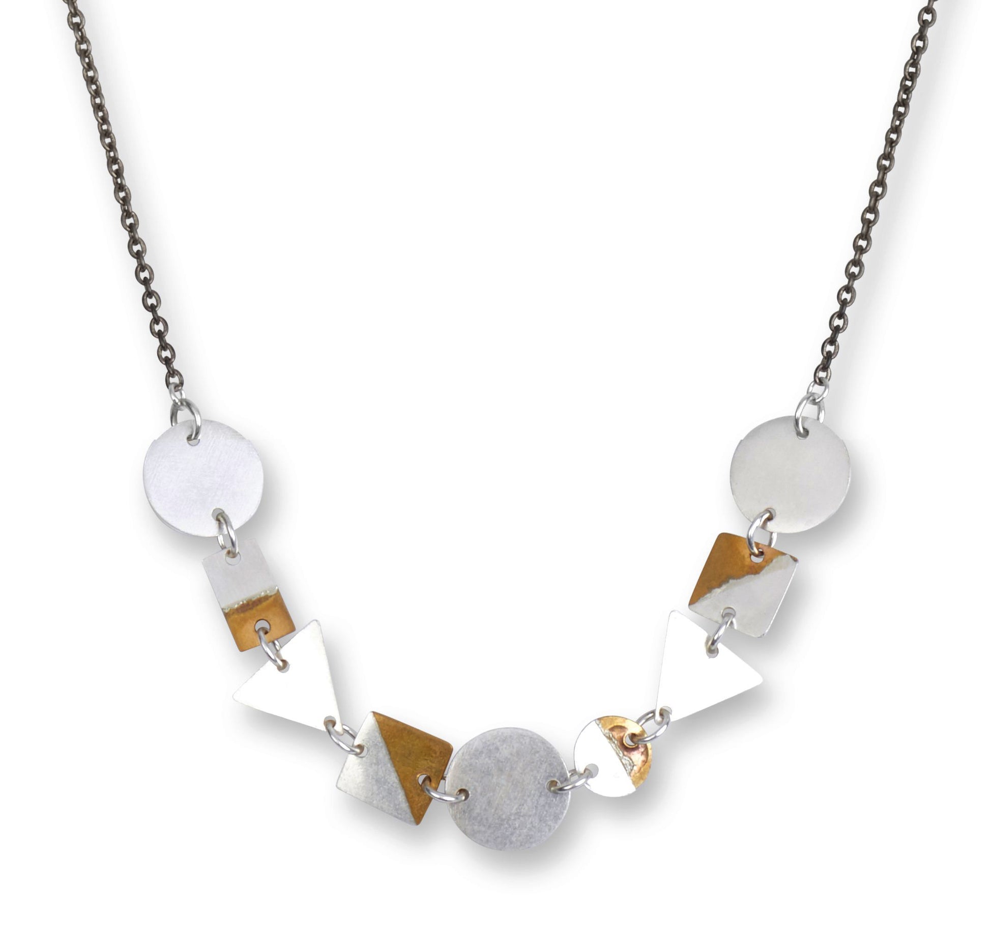 Striking Sterling Silver and gold-dipped brass necklace, 20". Several of the shapes incorporate both metals cleverly fused together. Design by Ruksana.