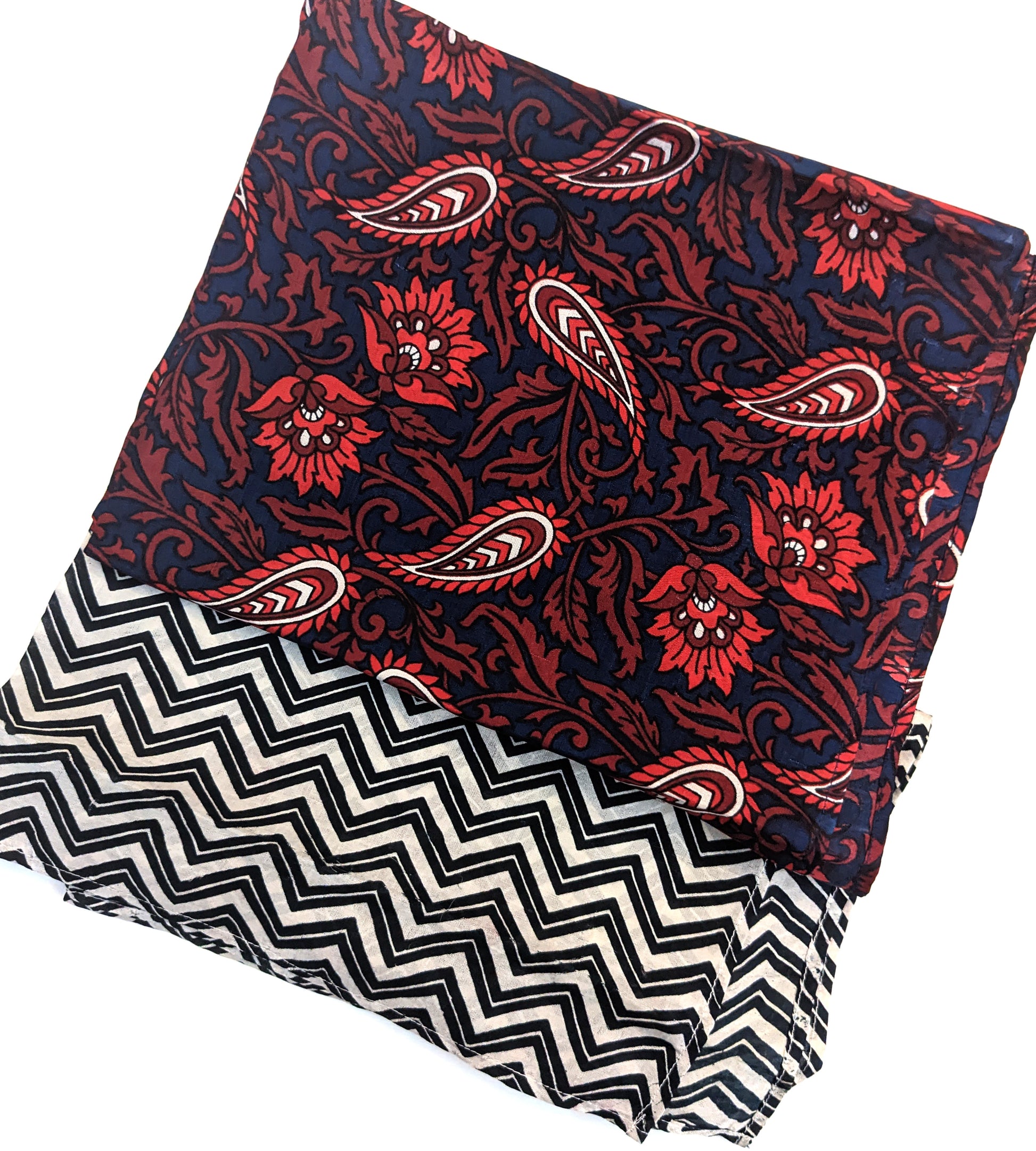 Exquisite silk scarf, 20" x 80", designed and printed at a shelter in Kolkata. Block and screen printing are complex and highly respected artisan skills, which were traditionally done only by men in India. Mastering this skill and earning a good wage enable survivors to rise above the circumstances of their past, to save money, and to rejoin society.