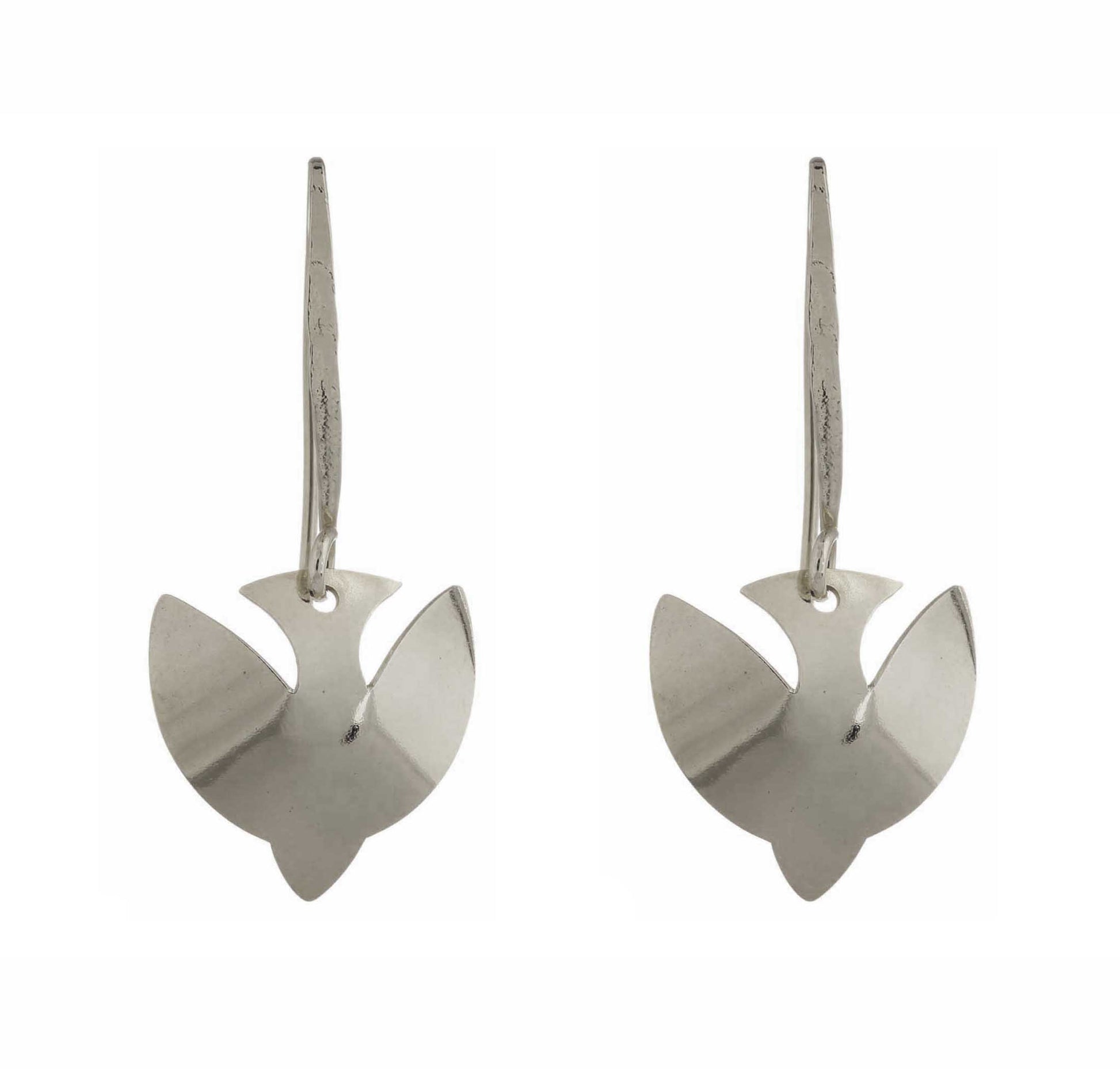 Sterling silver earrings featuring the image of a dove. Birds are an enduring image for freedom for the women in our jewelry program. Design by Melissa Tyson.