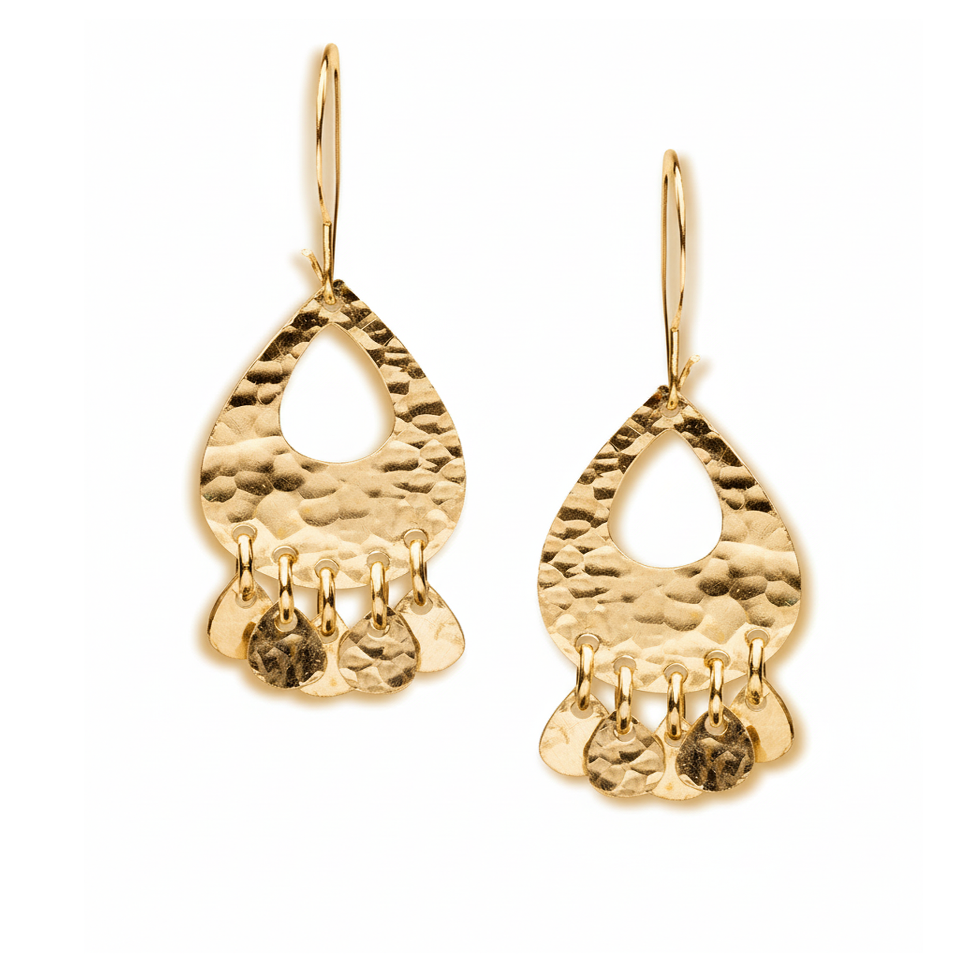 Express your joie de vivre with these stylish, Asian influenced hammer-textured earring. They feature five dangling teardrops, imbuing them with a sense of playful movement. Earrings are 2" tall (exclusive of ear wires). Says designer Dianna Badalament "Classical Indian jewelry is ornate with a lot of movement and dangles. When living in India and working to train our jewelry team there, I wanted to create something that would have a comfortably familiar aesthetic while teaching our artisans something new. In this case, the challenge was to fabricate such delicate and tiny parts, including the drilling holes so they can hang from the main piece. I had a wonderful experience working with the studio's peer leader to make the first sample of this joyful design".