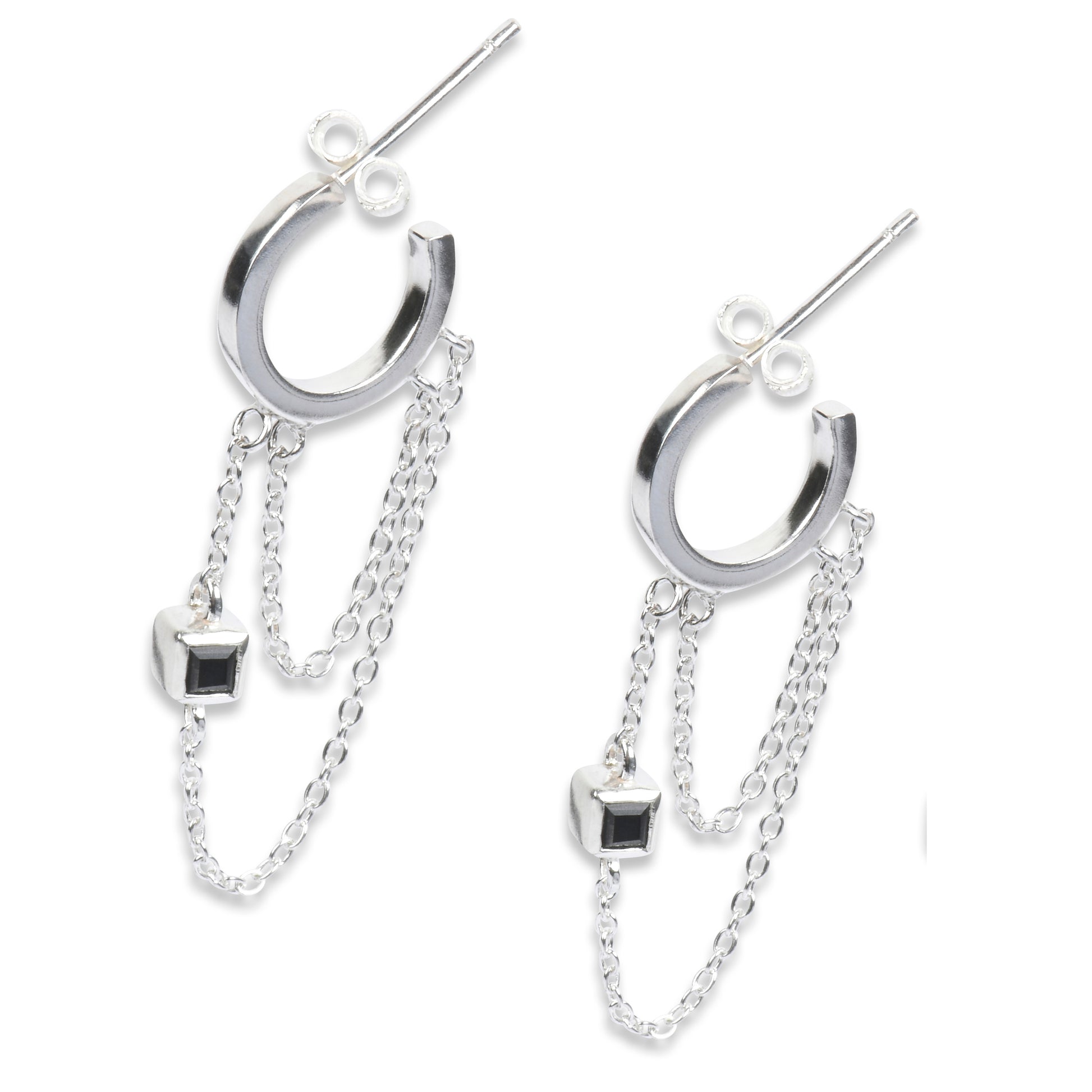 NEW - Sterling Silver huggie hoop earrings, with 1" and .5" silver chains accented with square-set Onyx gems. These unique and stylish earrings were designed by Tiffany Cruikshank, founder of Yoga Medicine and partner of Her Future through her SEVA Foundation.